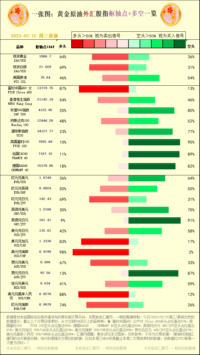 汇通财经APP讯——一张图:黄金原油外汇股指"枢纽点+多空占比"一览。今日(2023/02/15周三)最新出炉的数据显示,截止上个交易日结束时,头寸达到80%及以上的品种有:★ 富时中国A50 ☆FT...