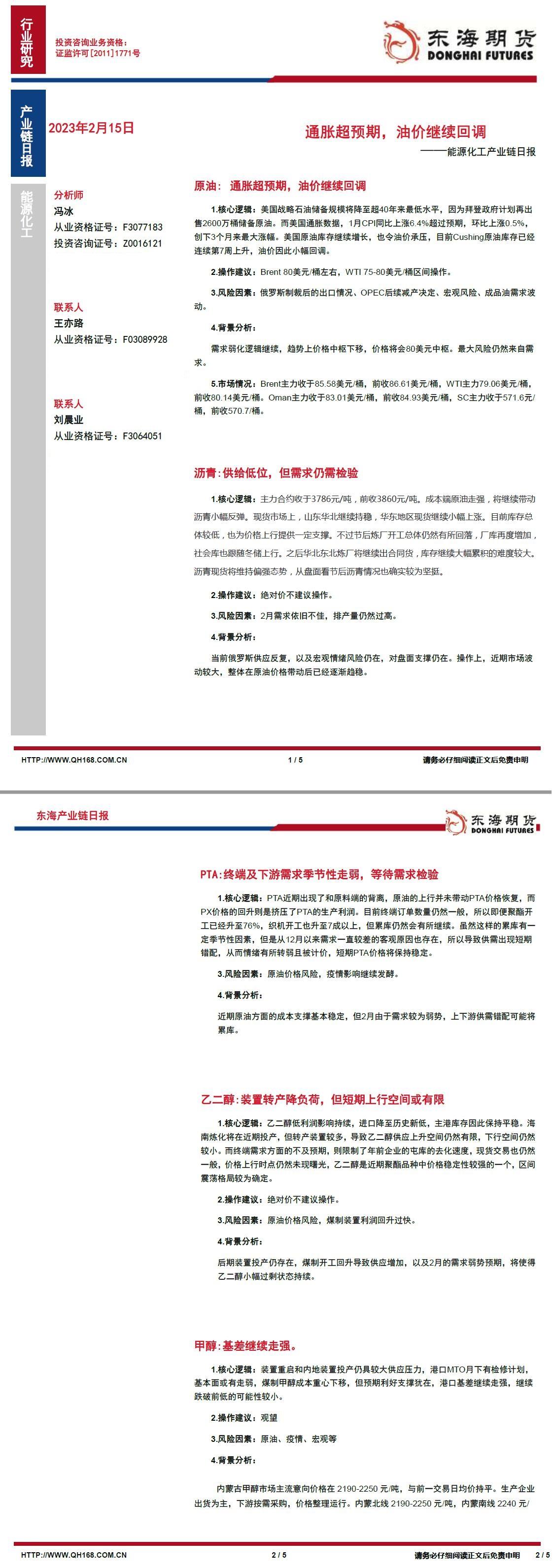 汇通财经APP讯——原油: 通胀超预期,油价继续回调沥青:供给低位,但需求仍需检验PTA:终端及下游需求季节性走弱,等待需求检验乙二醇:装置转产降负荷,但短期上行空间或有限甲醇:基差继续走强L:价格企...