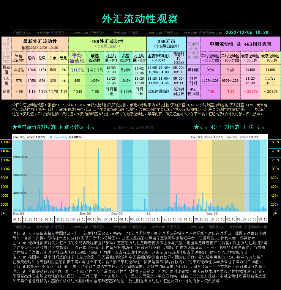 汇通财经APP讯——今日外汇流动性观察:截止2022/12/06 10:20,★以交易时间为研究对象,最近48小时平均流动性102%,较7天前上升。48小时最高流动性较7天前降至1417%;★当前外汇...