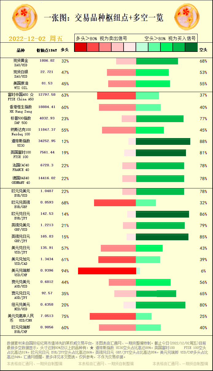 汇通财经APP讯——一张图:交易品种枢纽点+多空占比一览。截止今日(2022/12/02周五)目前最新多空数据显示,头寸达到80%及以上的品种有:★ 道琼斯指数 US30空头占比高达88%。英国富时1...
