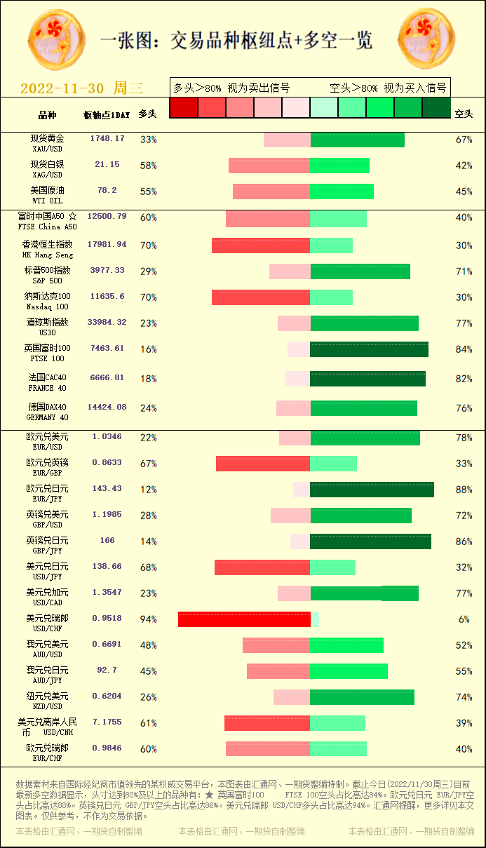 汇通财经APP讯——一张图:交易品种枢纽点+多空占比一览。截止今日(2022/11/30周三)目前最新多空数据显示,头寸达到80%及以上的品种有:★ 英国富时100 FTSE 100空头占比高达84%...