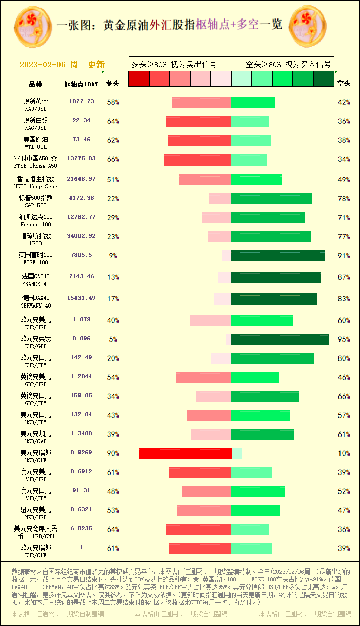 汇通财经APP讯——一张图:黄金原油外汇股指"枢纽点+多空占比"一览。今日(2023/02/06周一)最新出炉的数据显示,截止上个交易日结束时,头寸达到80%及以上的品种有:★ 英国富时100 FTS...