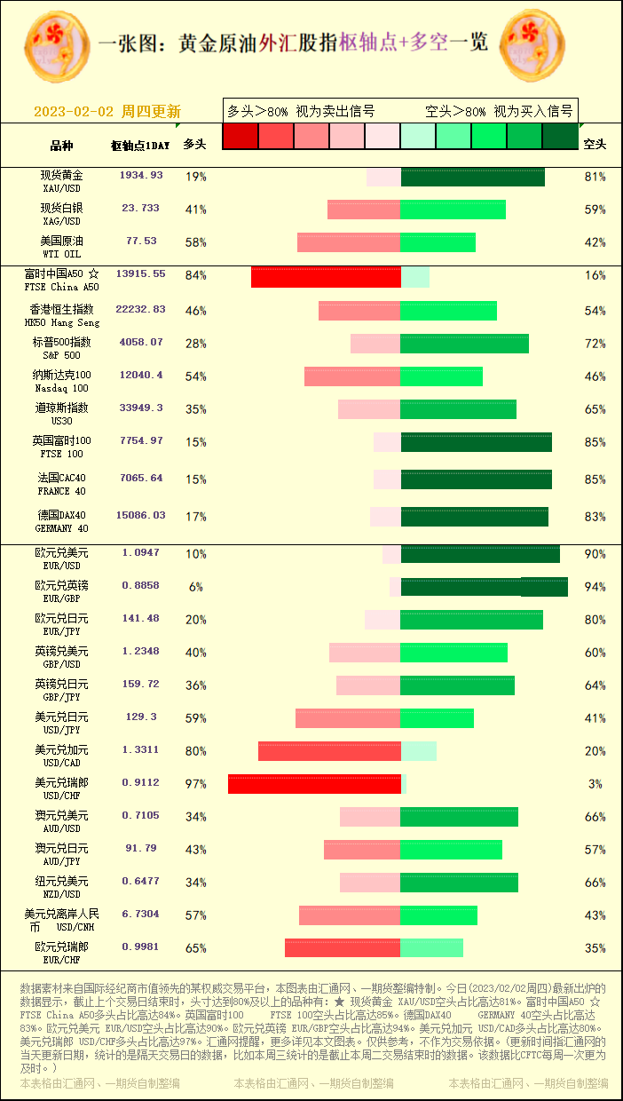 汇通财经APP讯——一张图:黄金原油外汇股指"枢纽点+多空占比"一览。今日(2023/02/02周四)最新出炉的数据显示,截止上个交易日结束时,头寸达到80%及以上的品种有:★ 现货黄金 XAU/US...