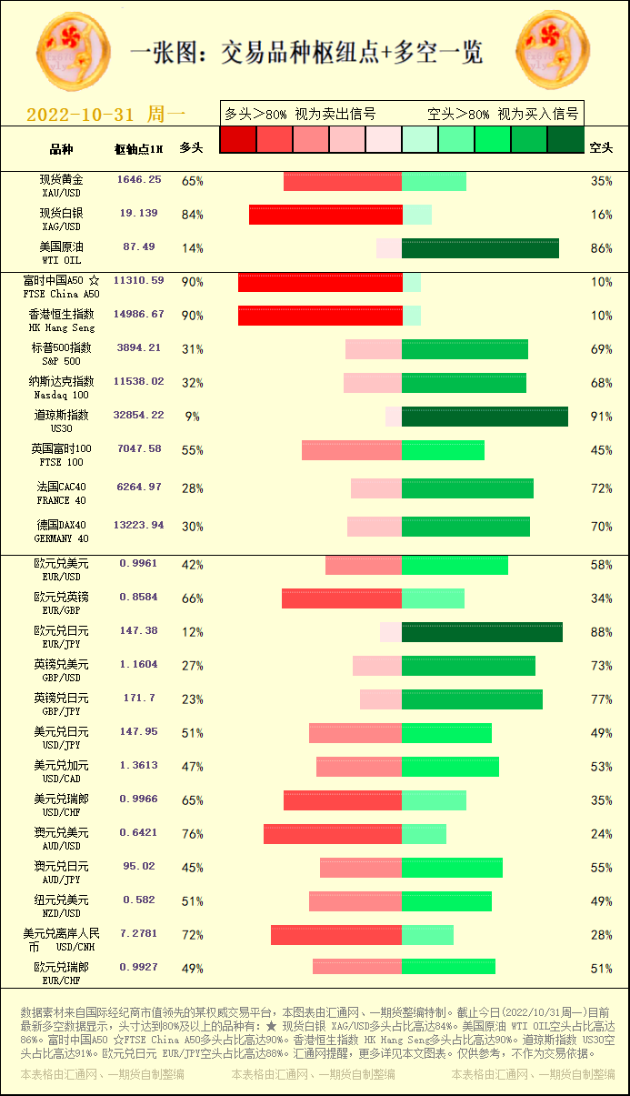 一张图:交易品种枢纽点+多空占比一览(2022/10/31周一)。截止今日(2022/10/31周一)目前最新多空数据显示,头寸达到80%及以上的品种有:★ 现货白银 XAG/USD多头占比高达84%...