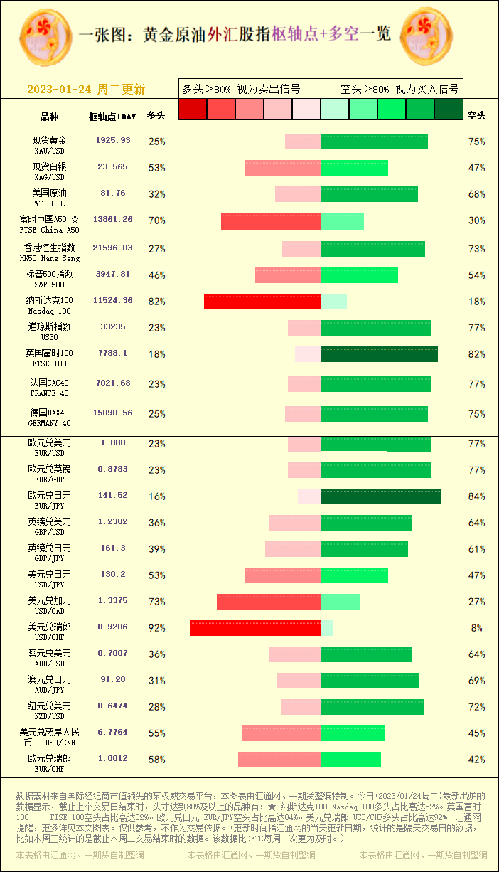 汇通财经APP讯——一张图:黄金原油外汇股指"枢纽点+多空占比"一览。今日(2023/01/24周二)最新出炉的数据显示,截止上个交易日结束时,头寸达到80%及以上的品种有:★ 纳斯达克100 Nas...