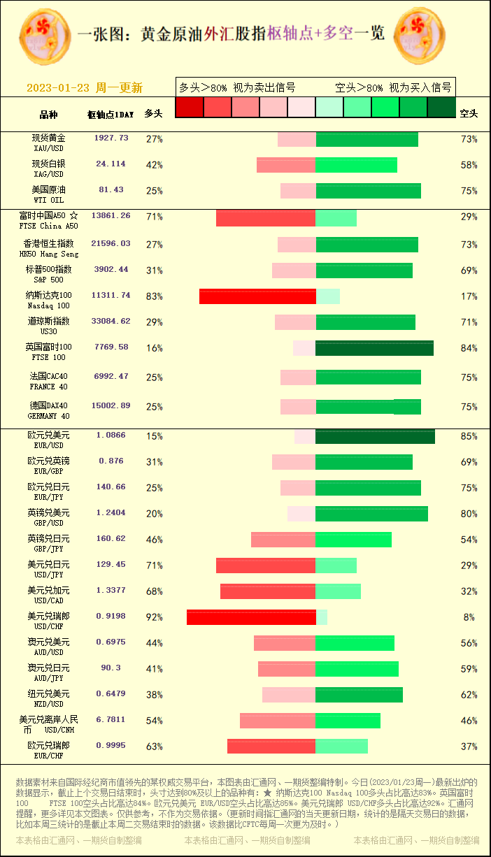 汇通财经APP讯——一张图:黄金原油外汇股指"枢纽点+多空占比"一览。今日(2023/01/23周一)最新出炉的数据显示,截止上个交易日结束时,头寸达到80%及以上的品种有:★ 纳斯达克100 Nas...