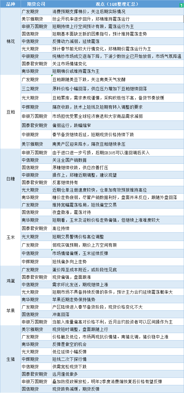 汇通财经APP讯——期货公司观点汇总一张图:1月6日农产品(棉花、豆粕、白糖、玉米、鸡蛋、生猪等)