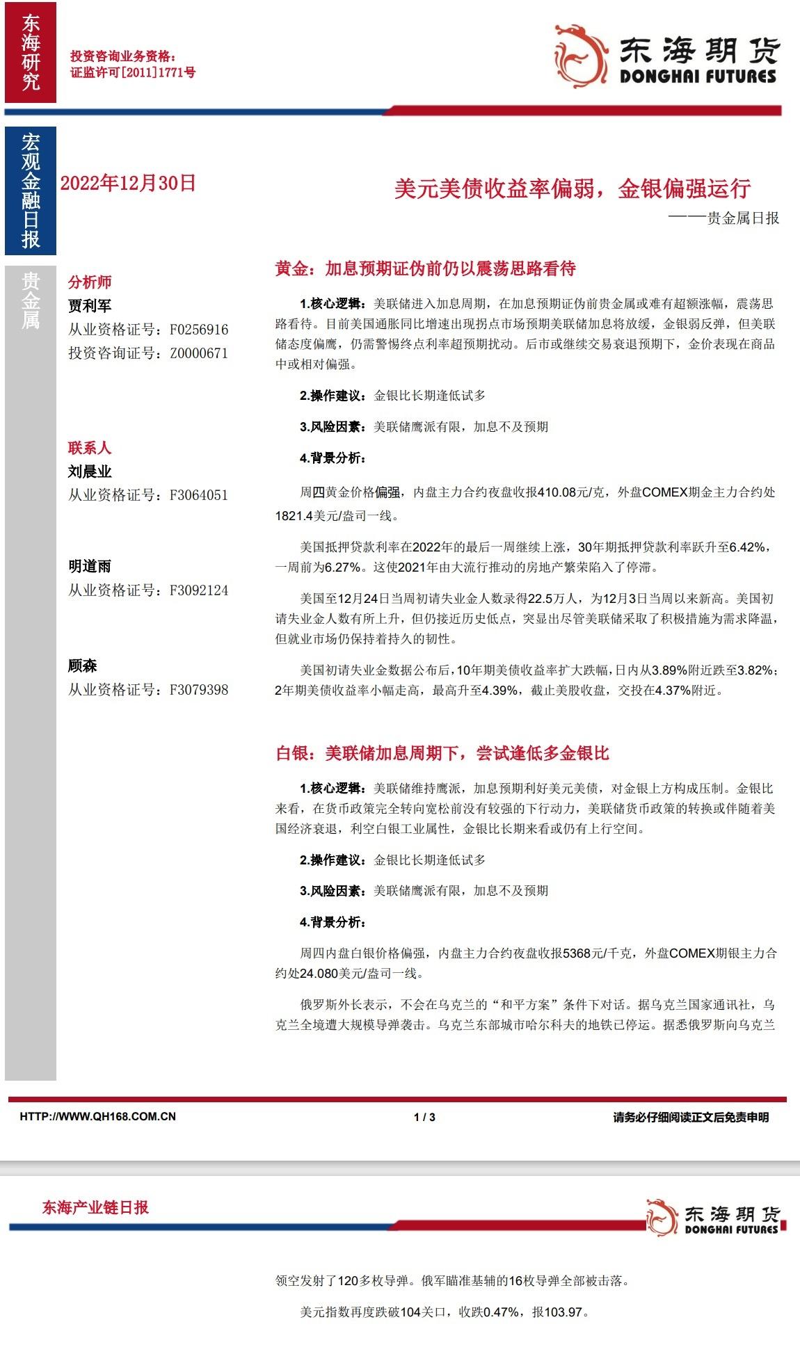 汇通财经APP讯——黄金:加息预期证伪前仍以震荡思路看待。白银:美联储加息周期下,尝试逢低多金银比。东海期货公司授权文本由“专注期货开户交易及专业行情分析资讯网站”:【一期货 www.1qh.cn】转...
