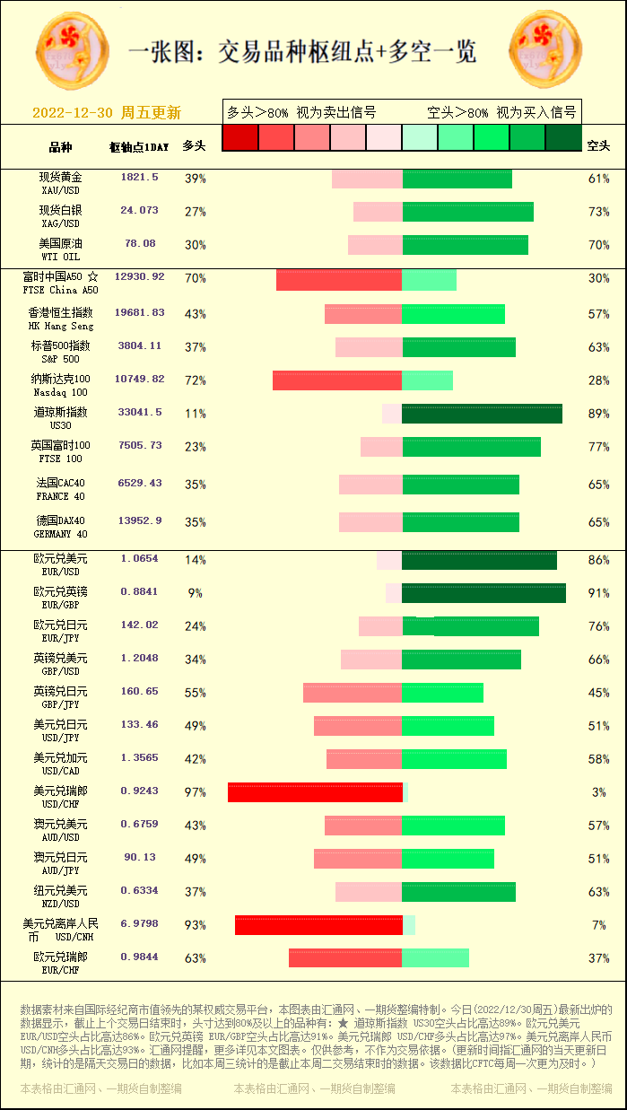 汇通财经APP讯——一张图:交易品种枢纽点+多空占比一览。今日(2022/12/30周五)最新出炉的数据显示,截止上个交易日结束时,头寸达到80%及以上的品种有:★ 道琼斯指数 US30空头占比高达8...