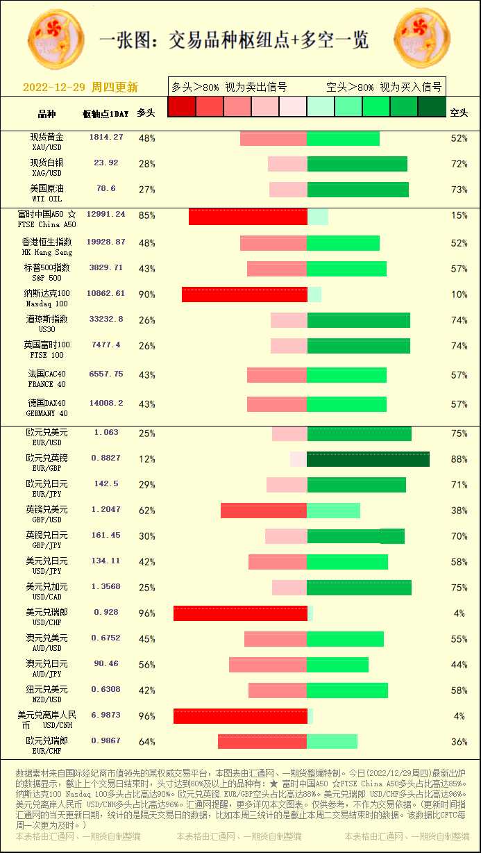 汇通财经APP讯——一张图:交易品种枢纽点+多空占比一览。今日(2022/12/29周四)最新出炉的数据显示,截止上个交易日结束时,头寸达到80%及以上的品种有:★ 富时中国A50 ☆FTSE Chi...