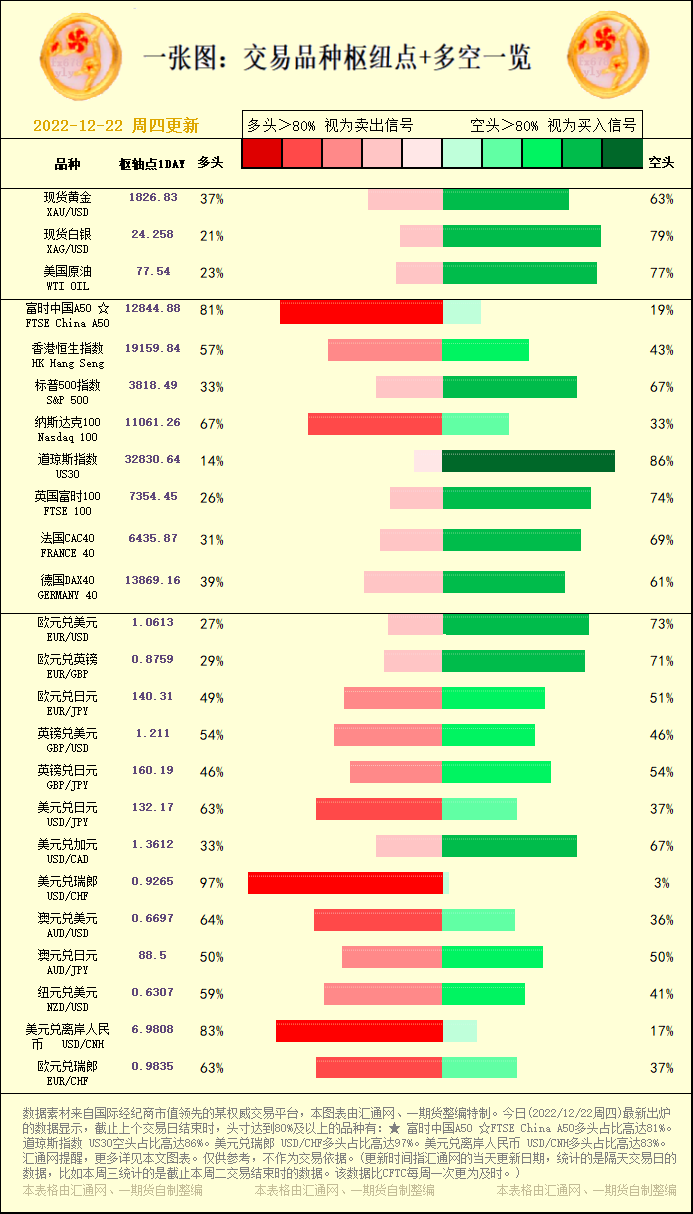 汇通财经APP讯——一张图:交易品种枢纽点+多空占比一览。今日(2022/12/22周四)最新出炉的数据显示,截止上个交易日结束时,头寸达到80%及以上的品种有:★ 富时中国A50 ☆FTSE Chi...