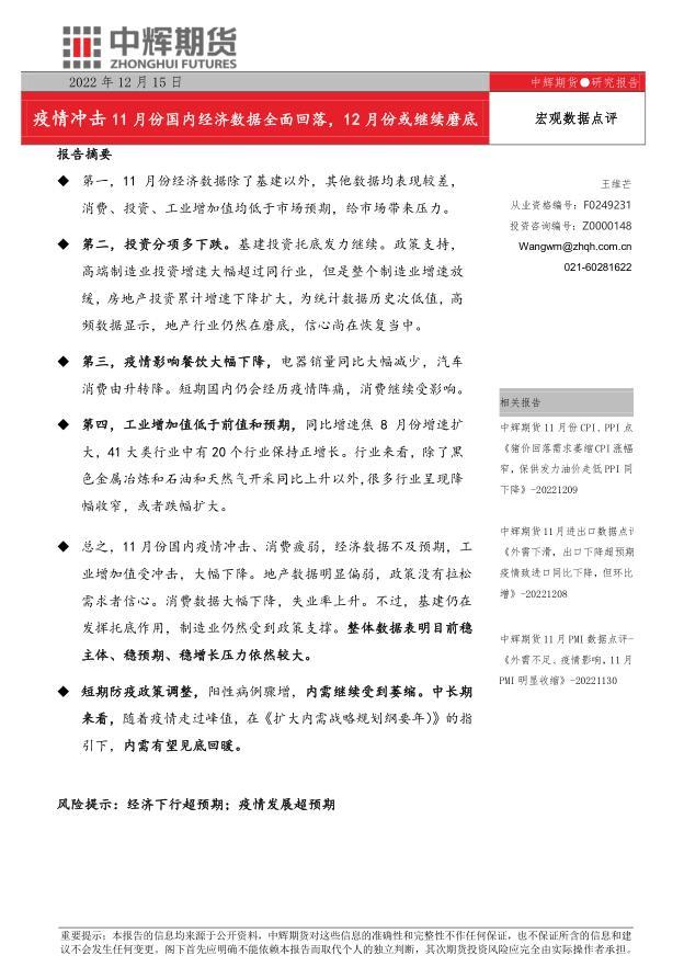 汇通财经APP讯——报告摘要第一,11 月份经济数据除了基建以外,其他数据均表现较差,消费、投资、工业增加值均低于市场预期,给市场带来压力。第二, 投资分项 多下跌 。基建投资托底发力继续。政策支持,...