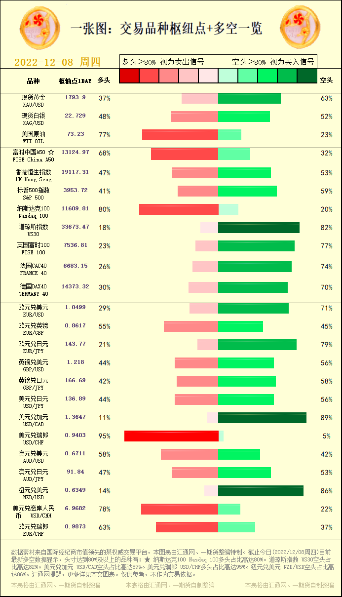汇通财经APP讯——一张图:交易品种枢纽点+多空占比一览。截止今日(2022/12/08周四)目前最新多空数据显示,头寸达到80%及以上的品种有:★ 纳斯达克100 Nasdaq 100多头占比高达8...