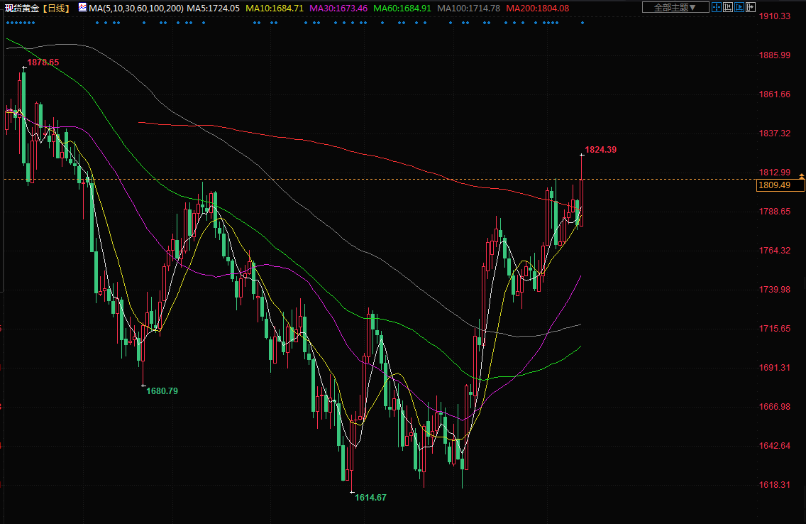 黄金周二上涨超过1%,达到五个多月来的最高点,此前美国消费者物价的上涨幅度小于预期,推动了对美联储放缓加息的押注。现货金攀升1.7%至每盎司1810.98美元,盘初一度触及6月30日以来的最高点。