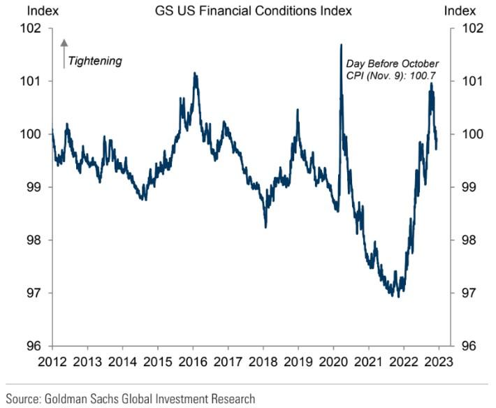 高盛的金融状况指数现在已从最近的峰值回落了约100个基点,他们对金融状况收紧拖累2023年经济增长的估计已经大幅下降。