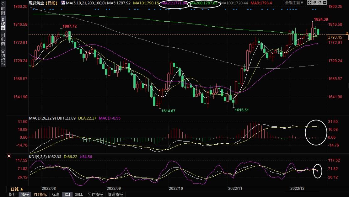 由于21日均线仍在向上发散,在失守21日均线前,多头仍有一定的机会,上方1800整数关口目前已经转化为初步阻力所在,隔夜高点阻力在1814.00附近,若能顶破该阻力,则削弱短线看空信号。