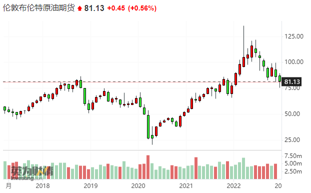 今年6月以来,美、布两油几乎连月走低,仅10月小幅回升。截止发稿, 美国WTI原油期货报每桶76美元,年内最高曾达到130美元,接近腰斩;而布伦特原油期货报每桶81美元,年内也曾一度达到134美元。