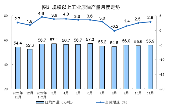 原油生产稳定增长,进口保持较快增长。11月份,生产原油1678万吨,同比增长2.9%,增速比上月加快0.4个百分点,日均产量55.9万吨。进口原油4674万吨,同比增长11.8%,增速比上月放缓2.3个百分点。
