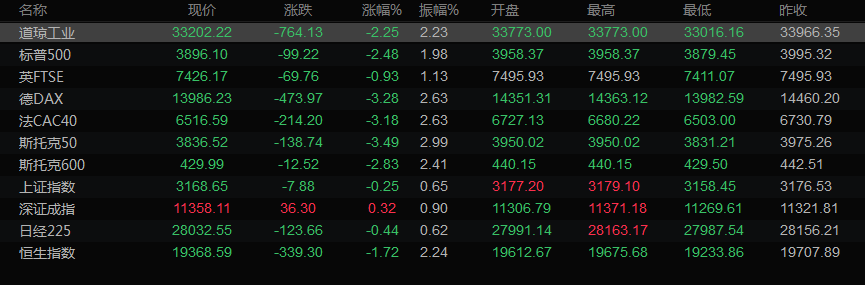 美股收盘情况:道琼斯工业指数下跌2.25%,至33202.22点;标普500指数大跌2.49%,至3895.75点;纳斯达克指数重挫3.23%,至10810.53点。