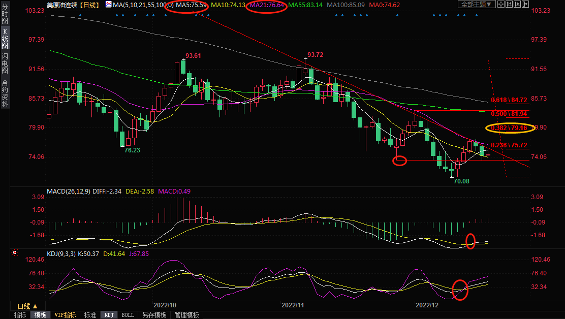 由于MACD金叉,KDJ金叉,在失守73.58前,多头仍有震荡筑底的机会,初步阻力在5日均线75.59附近,21日均线阻力目前在76.64附近,若能顶破该阻力,则增加短线看涨信号;93.72-70.08跌势的38.2%回撤位阻力在79.16附近。