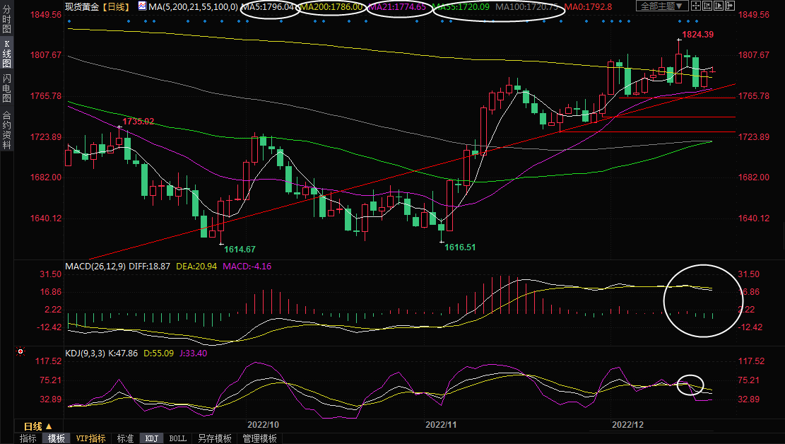 上方5日均线阻力目前在1796.04附近,然后是1800整数关口,上周三高点阻力在1814.00附近,若能收复该位置,则破坏短线看空信号。