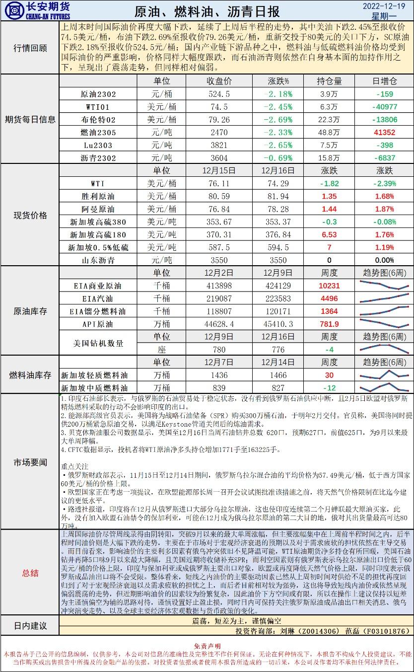 长安期货原油早评:短差为主,谨慎偏空 Dec 19,2022 汇通财经APP讯——12月19日,长安期货发布原油早评,认为原油将震荡,短差为主,谨慎偏空。长安期货公司授权文本由“专注期货开户交易及专业行情分析资讯网站”:【一期货 www.1qh.cn】转发