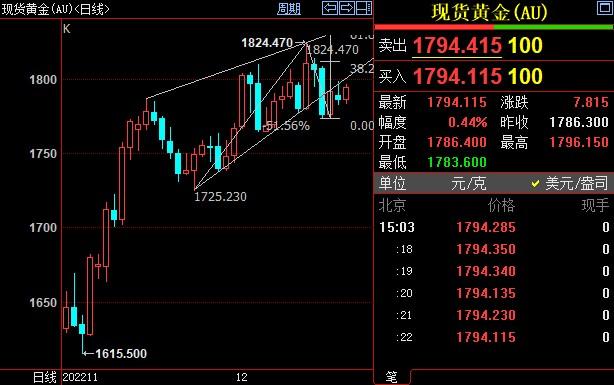 北京时间15:04,现货黄金上涨0.36%至1793.96美元/盎司;COMEX期金主力合约上涨0.28%至1802.7美元/盎司;美元指数下跌0.28%至104.376。