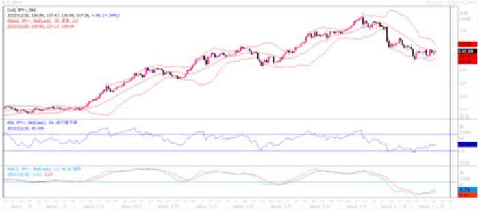 周一(12月19日),美元兑日元略微上涨0.14%,收盘于136.90。主要是当日美债收益率有所回升,令美元兑日元产生反弹。美联储包括主席鲍威尔上周对于加息继续保持强硬态度,即通胀不大目标,加息不止。尽管如此,金融市场似乎对美联储的鹰派立场并不买账。联邦基金期货市场已经对2023年底前的降息进行了定价。多伦多Corpay的首席市场策略师KarlSchamotta说:“很少有人预计美联储会兑现周三的鹰派立场。”今年以来,由于美联储大力加息,吸纳资金回流到以美元计价的债券,该指数已经飙升了约9%。然而,自9月份创下20年高点以来,美元指数已经下跌了约8%,因为美国通胀放缓,使人们对美联储的加息周期可能很快结束产生了希望。而目前日本央行似乎也有想让其货币政策回归正常的苗头。因此,日元在年底前料不会出现大幅走弱的机会。日线图上,美元兑日元继续维持在区间的横盘徘徊走势形态之中。MACD信号线出现底部交叉,且近期美日价位的低点有逐步升高的倾向,上近期横盘的上方阻力137.80一旦被穿越,则美元兑日元极有可能往140反弹。