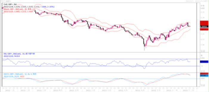 周一(12月19日),英镑兑美元全日几乎无太大变动,收盘持平于前个交易日的水平1.2152。上周欧美各央行在关于今后加息的态度上,明显美联储和欧洲央行要比英国央行坚决,英国央行内部的票委们开始出现了不统一的声音,这也是近期英镑兑美元出现被抛售中断了前期形成的上升走势的原因所在。但不管怎样,现在有美联储放缓加息,还有欧央行的强硬表态,都是压制美元的有效砝码,因此也能给英镑提供相应的支撑,所以这个时候,英镑也不会出现延续下跌的情况。技术面的走势来看,接连7根4小时结构的k线,一直处于这段调整的行情当中,而且接连三次测试1.213的价格都没能延续跌破,说明现在的多头还没有被击破,仍有延续上涨的机会。而且1.214-1.216还是上一段阶梯式上行支撑,rsi指标也处于拐头的节奏当中,唯一的威胁也就是价格跌破60-100日均线了,不过在年内最后一个交易周内,预料该威胁性应不大。