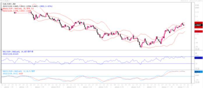 周一(12月19日)欧元兑美元涨幅0.17%,收报于1.0608。欧洲央行副行长金多斯周一表示,随着官员们试图抑制物价飙升,借款成本将继续以与最近50个基点类似的速度继续上升。他这种鹰派论调促使经济学家和投资者上调了对欧洲央行加息幅度的预测。而且来自德国的市场数据表明,这个欧洲最大规模经济体的经济衰退可能比几周前许多经济学家担心的要温和得多。也就是说,欧央行继续上调利率,对于欧洲的经济打击目前来说还是可接受范围内的。这也是欧元在本周一外汇市场上得以站稳的原因。在日线图上,欧元兑美元继续维持在20日均线上方,整体上还是继续呈高位区间小幅盘整态势。纵观自11月份以来的走势情况,高低点位拾级而上,形成了较完整的上升通道。若欧元兑美元能继续保持在1.05水平之上,后市继续攀高仍可期。