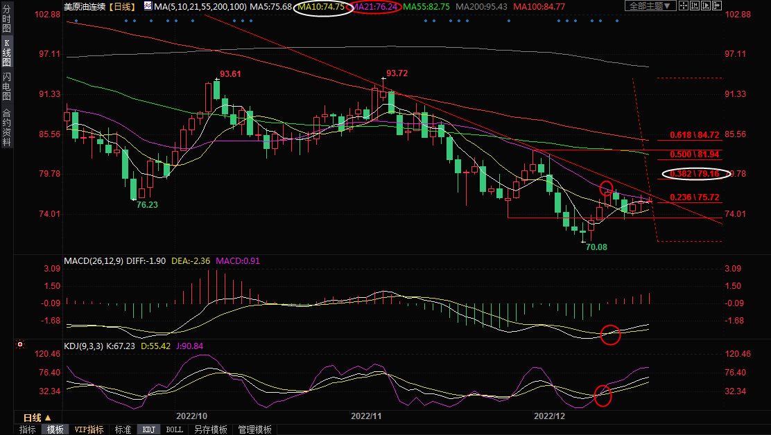 日线级别:震荡;MACD金叉,KDJ金叉,10日均线给油价提供支撑,关注12月15日高点77.73附近阻力,若能顶破该阻力,则增加后市看涨信号,进一步阻力在93.72-70.08跌势的38.2%回撤位79.16附近,然后是80整数关口附近阻力,50%回撤位阻力在81.94附近。