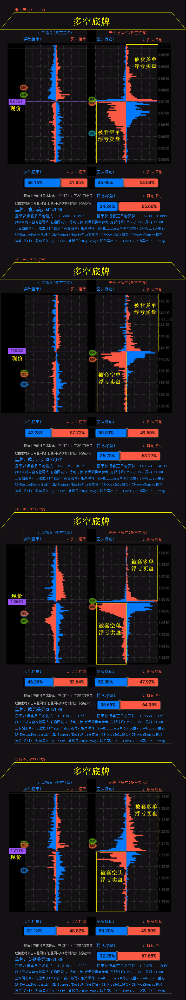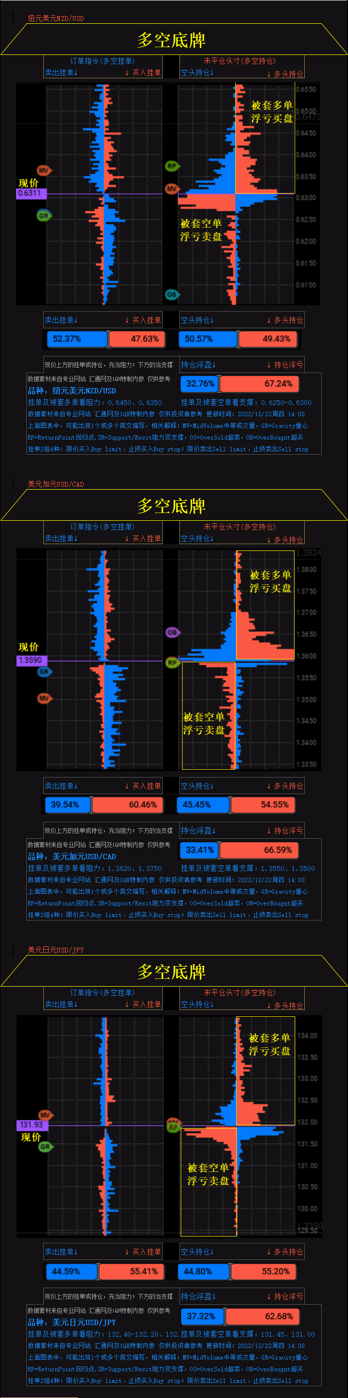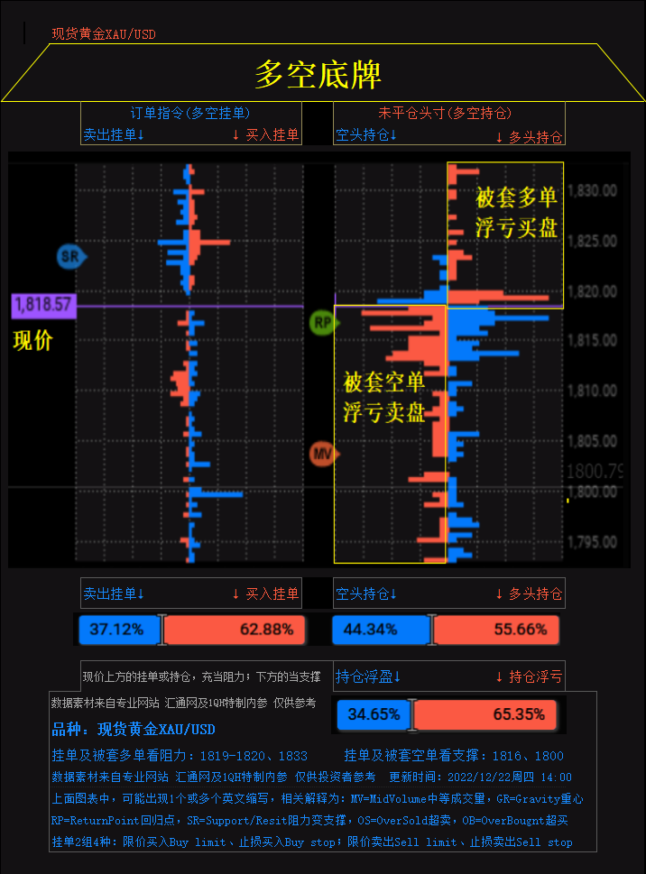 黄金、七大货币对的“多空底牌”一览(2022/12/22周四) Dec 22,2022 汇通财经APP讯——黄金、七大货币对的“多空底牌”一览(2022/12/22周四)。国际现货黄金挂单及被套多单看阻力:1819-1820、1833;挂单及被套空单看支撑:1816、1800。外汇货币对有:澳元美元、美元加元、美元日元、纽元美元、欧元美元、欧元日元、英镑美元。详见下图。本文数据素材来自专业网站,汇通网及1QH特制内参,仅供投资者参考。本文图表中,可能出现1个或多个英文缩写,相关解释为:MV=MidVolume中等成交量,GR=Gravity重心,RP=ReturnPoint回归点,SR=Support/Resit阻力变支撑,OS=OverSold超卖,OB=OverBougnt超买。挂单2组4种:限价买入Buy limit、止损买入Buy stop;限价卖出Sell limit、止损卖出Sell stop。