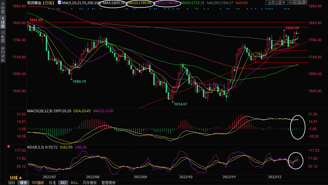 不过,MACD高位粘合,暗示短线上涨动能还不是很强,仍需提防金价冲高回落假突破的可能性,下方初步支撑在5日均线1805.43附近,10日均线支撑在1800整数关口附近,100日均线支撑在1784.85附近,如果意外失守该支撑,则增加短线看空信号。