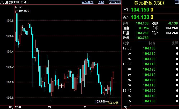 北京时间19:39,现货黄金上浮0.02%至1814.50美元/盎司;COMEX期金主力合约下跌0.10%至1823.5美元/盎司;美元指数下跌0.13%至104.117,美指盘中跌创一周新低至103.742。
