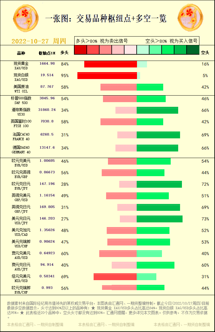 一张图:交易品种枢纽点+多空占比一览(2022/10/27周四) Oct 27,2022 一张图:交易品种枢纽点+多空占比一览。截止今日(2022/10/27周四)目前最新多空数据显示,头寸达到80%及以上的品种有:★ 现货黄金 XAU/USD多头占比高达84%。现货白银 XAG/USD多头占比高达95%。★ 此表格近20个品种中,空头头寸都没有达到80%。汇通网提醒,更多详见本文图表。仅供参考,不作为交易依据。【本图表涉及到的交易品种有:现货黄金、现货白银、美国原油、富时中国A50、香港恒生指数、标普500指数、纳斯达克指数、道琼斯指数、英国富时100、法国CAC40、德国DAX40、欧元兑美元、欧元兑英镑、欧元兑日元、英镑兑美元、英镑兑日元、美元兑日元、美元兑加元、美元兑瑞郎、澳元兑美元、澳元兑日元、纽元兑美元、美元兑离岸人民币、欧元兑瑞郎。】
