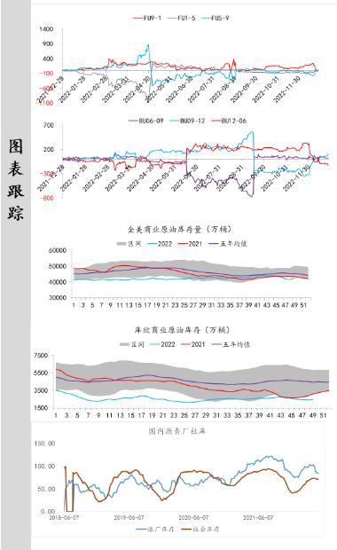 供应端:据美国能源信息署最新数据显示,截止2022年12月16日当周,包括战略储备在内的美国原油库存总量79685.8万桶,比前一周下降954.2万桶;美国商业原油库存41823.4万桶,比前一周下降589.5万桶;战略原油库存量37862.4万桶,比上一周下降364.7万桶;美国汽油库存总量22611.3万桶,比前一周上升253万桶。商业原油库存比去年同期低1.26%,比过去五年同期低7.19%;汽油库存比去年同期低0.89%,比过去五年同期低约1.92%;馏分油库存比去年同期低3.40%,比过去五年同期低7.58%。