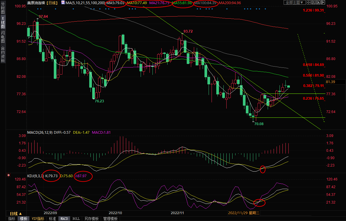 日线级别:震荡下跌后反弹;MACD金叉,KDJ金叉但接近超买区域,上一交易日油价录得十字星,暗示上方阻力较强,短线油价面临一些回调风险,初步支撑在5日均线79.03附近,10日均线支撑在77.50附近,21日均线支撑在76.62附近,如果失守该支撑,则增加后市看空信号。