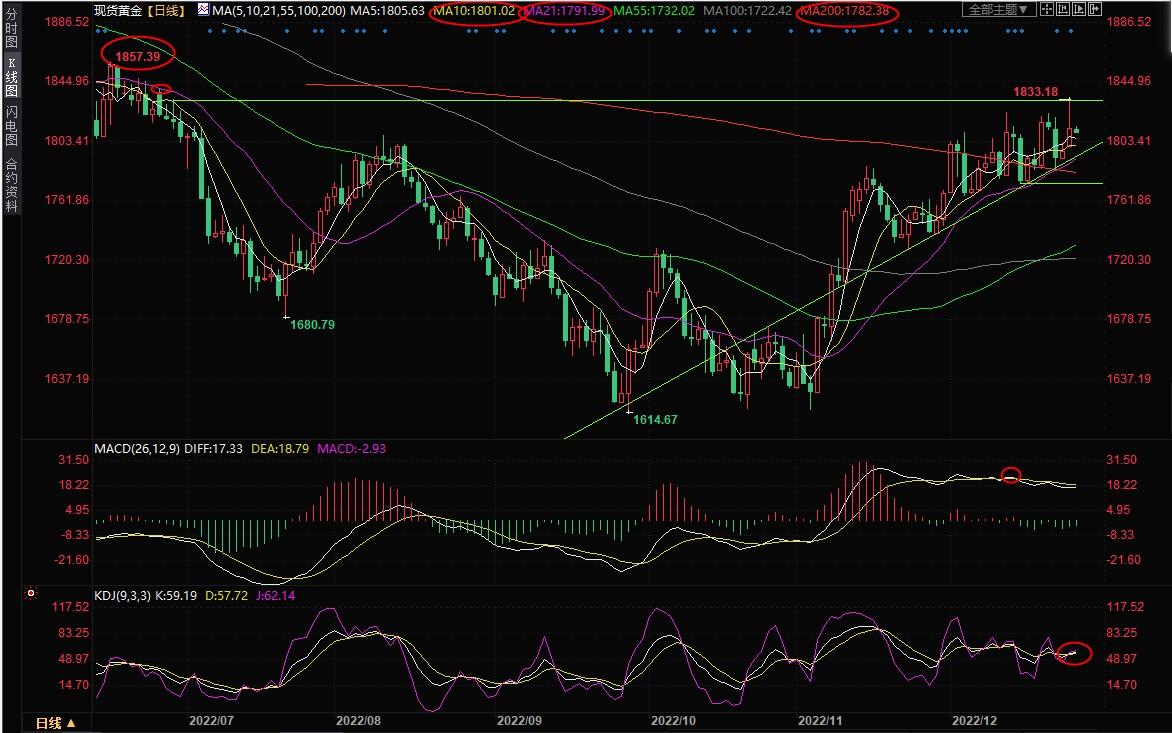 下方初步支撑在1800整数关口附近,21日就行支撑在1791.98附近,若失守该支撑,则削弱短线看涨信号;200日均线支撑在1782.38附近;12月15日低点支撑在1773.56附近。