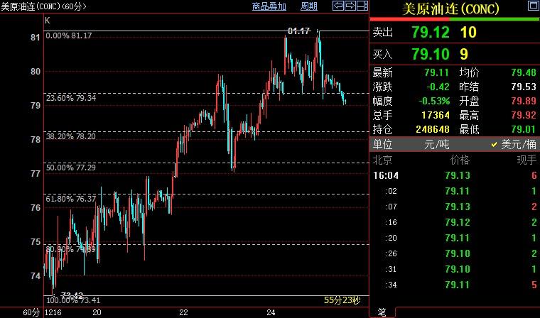 小时图上看,NYMEX原油跌破79.34美元,后市下看78.21美元,它们分别是73.42美元-81.17美元上涨区间的23.6%斐波那契回档位和38.2%%斐波那契回档位。