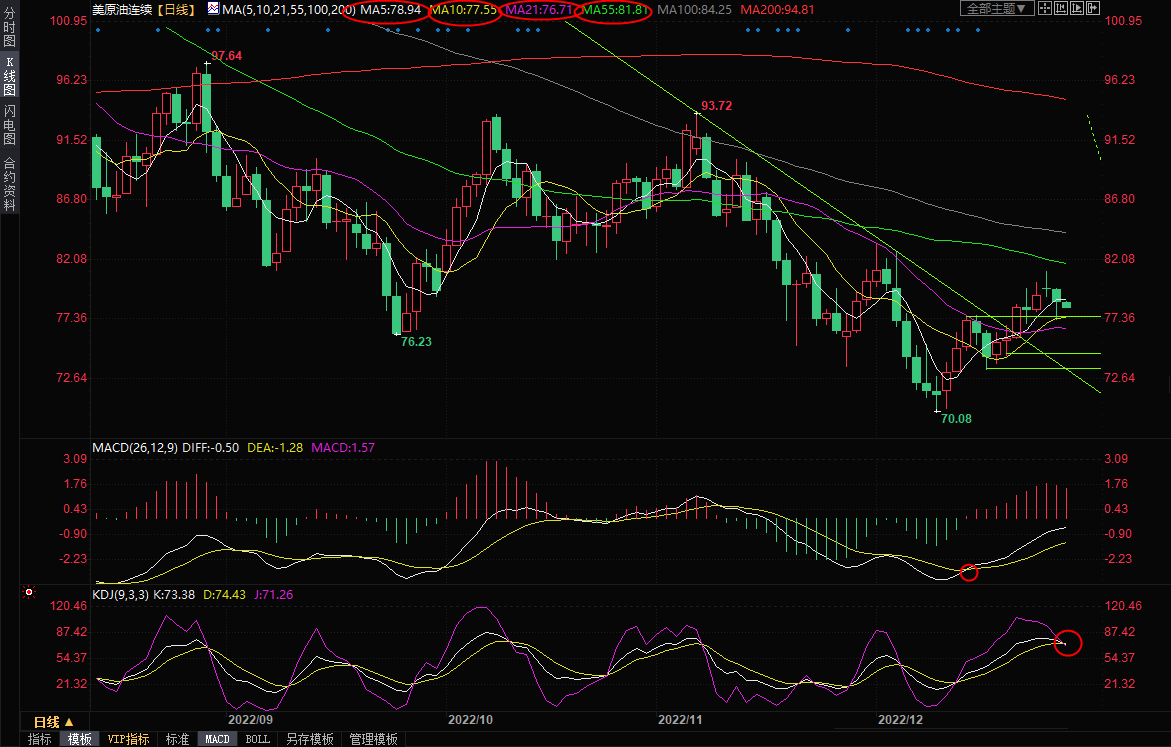 日线级别:震荡反弹受阻;油价的反弹受到了前期跌势50%回撤位附近阻力压制,K线出现了“黄昏之星”顶部信号,KDJ初步死叉,需要提防油价重回跌势的风险,初步支撑在10日均线77.54附近,21日均线支撑在76.70附近,若失守该支撑,则增加短线看空信号。12月20日低点支撑在74.44附近,12月16日低点支撑在73.31附近。
