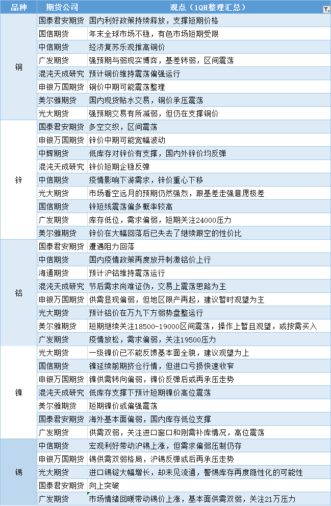 标题:期货公司观点汇总一张图:12月29日有色系(铜、锌、铝、镍、锡等)