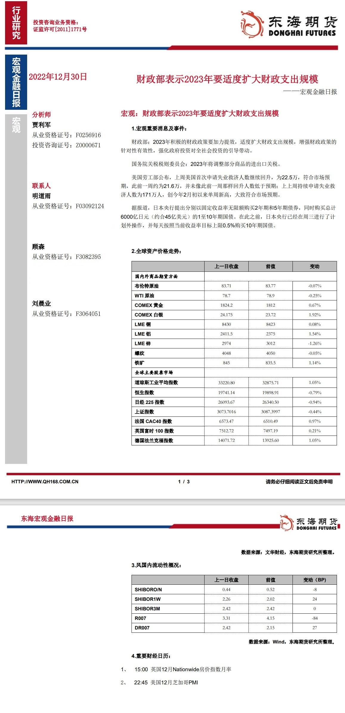 【东海期货12月30日宏观金融日报】:财政部表示2023年要适度扩大财政支出规模 Dec 30,2022 汇通财经APP讯——美国劳工部公布,上周美国首次申请失业救济人数继续回升,为22.5万,符合市场预期,此前一周约为21.6万,并未像此前一周那样回升人数低于预期;上上周持续申请失业救济人数为171万人,创今年2月初以来单周新高,大致符合市场预期。东海期货公司授权文本由“专注期货开户交易及专业行情分析资讯网站”:【一期货 www.1qh.cn】转发