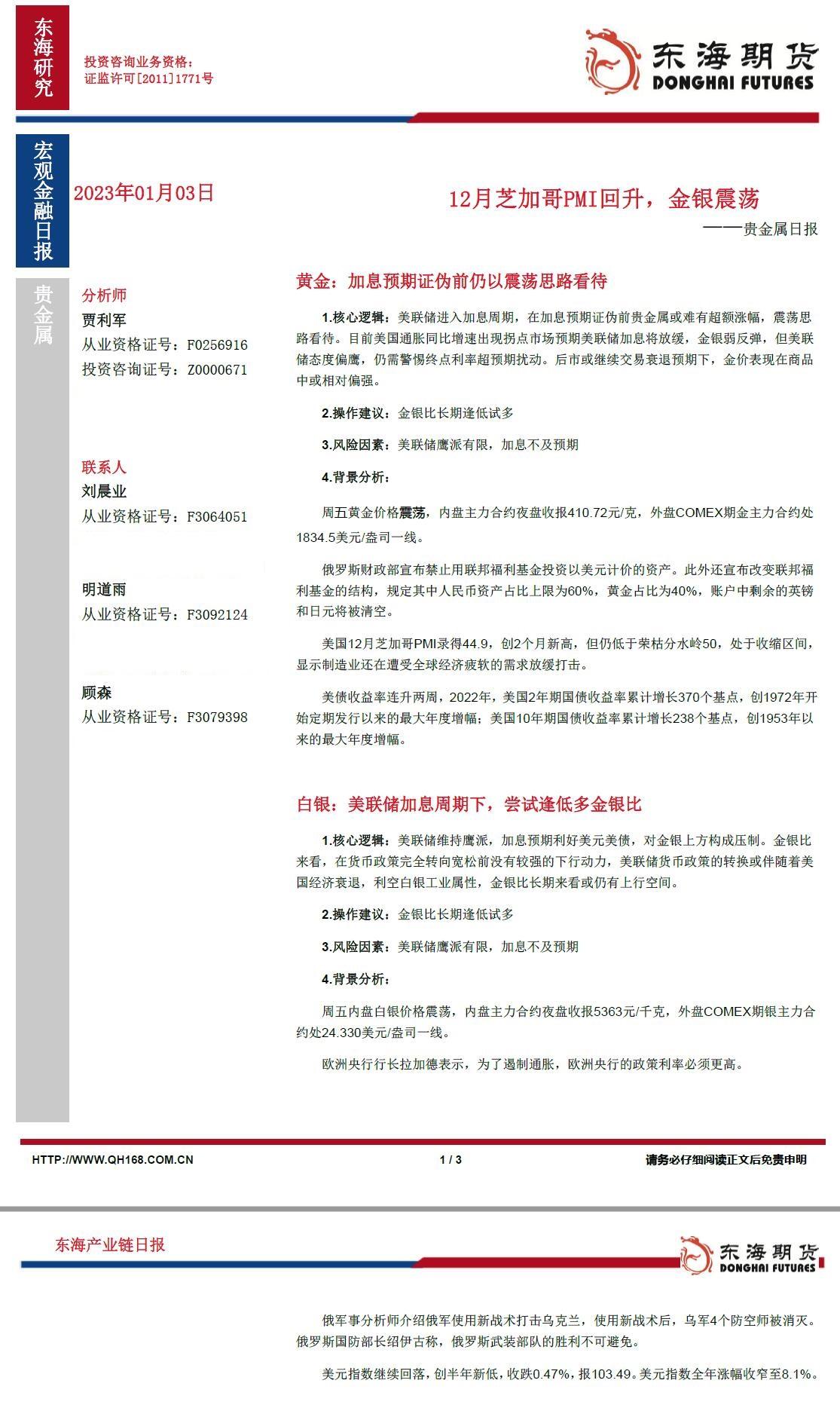 标题:【东海期货1月3日产业链日报】贵金属篇:12月芝加哥PMI回升,金银震荡