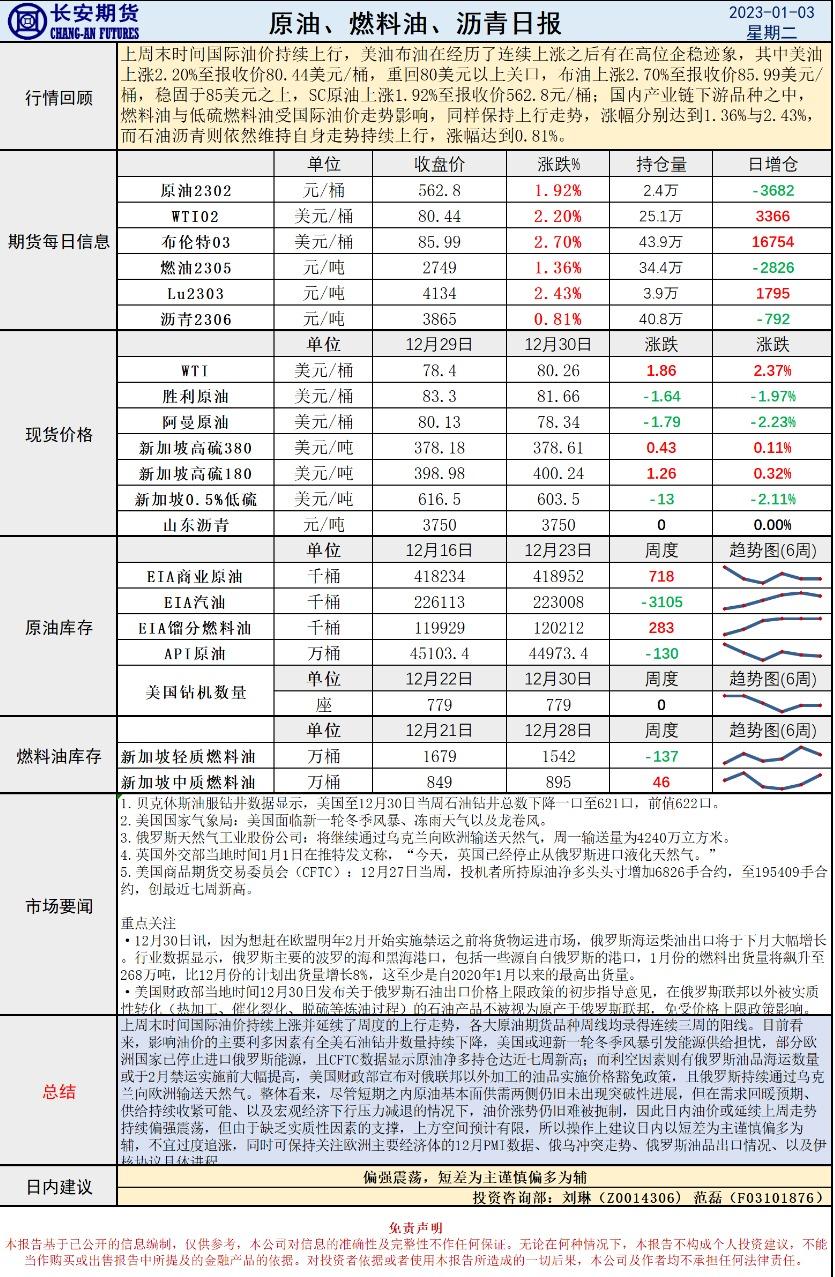 长安期货原油早评:偏强震荡,短差为主谨慎偏多为辅 Jan 03,2023 汇通财经APP讯——1月3日,长安期货发布原油早评,偏强震荡,短差为主谨慎偏多为辅。长安期货公司授权文本由“专注期货开户交易及专业行情分析资讯网站”:【一期货 www.1qh.cn】转发