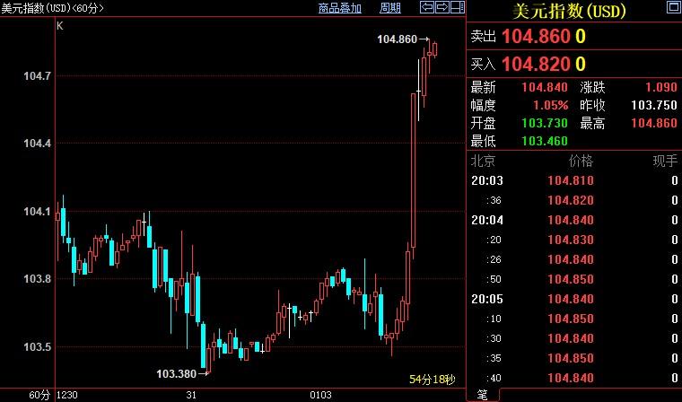 北京时间20:05,现货黄金上涨0.49%至1832.16美元/盎司;COMEX期金主力合约上涨0.66%至1838.3美元/盎司;美元指数上涨1.08%至104.851。