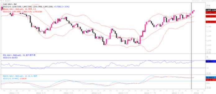 技术层面上,日线级别图上,短期均线多头排列,金价处于上涨通道,KDJ金叉,MACD绿色柱翻红且有金叉趋势,短线金价偏向多头,有望进一步涨向上涨通道上轨附近,大约在1857附近,6月16日高点1857.39阻力也在该位置附近。短线的话,6月份高点1850附近也还存在一些阻力,中线目标可以参考6月13日高点1878.65附近。下方初步支撑在12月27日高点1833.18附近,5日均线支撑在1819.79附近,如果意外回落至上述位置下方,则削弱短线看涨信号。