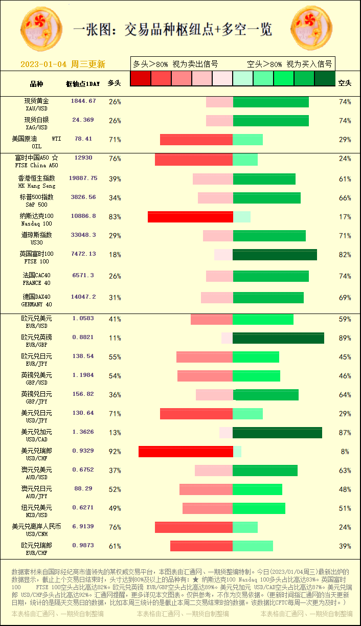 汇通财经APP讯——一张图:交易品种枢纽点+多空占比一览(2023/01/04周三)。今日(2023/01/04周三)最新出炉的数据显示,截止上个交易日结束时,头寸达到80%及以上的品种有:★ 纳斯达克100 Nasdaq 100多头占比高达83%。