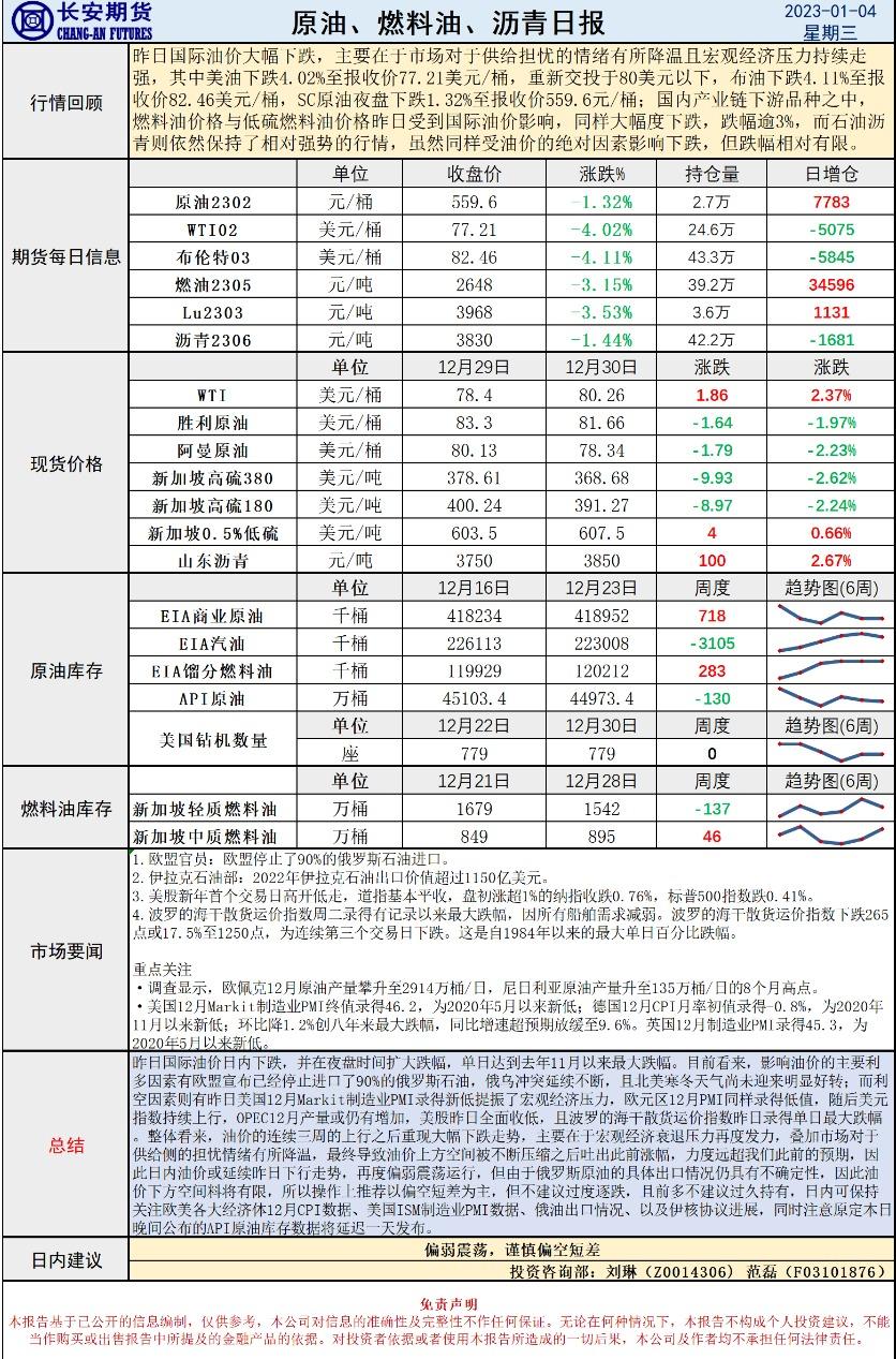 长安期货原油早评:价格将偏弱震荡,谨慎偏空短差 Jan 04,2023 汇通财经APP讯——1月4日,长安期货发布原油早评,认为原油将偏弱震荡,谨慎偏空短差。 长安期货公司授权文本由“专注期货开户交易及专业行情分析资讯网站”:【一期货 www.1qh.cn】转发