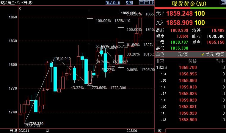 北京时间19:44,现货黄金上涨1.05%至1858.22美元/盎司;COMEX期金主力合约上涨0.98%至1864.2美元/盎司;美元指数下跌0.57%至104.091。