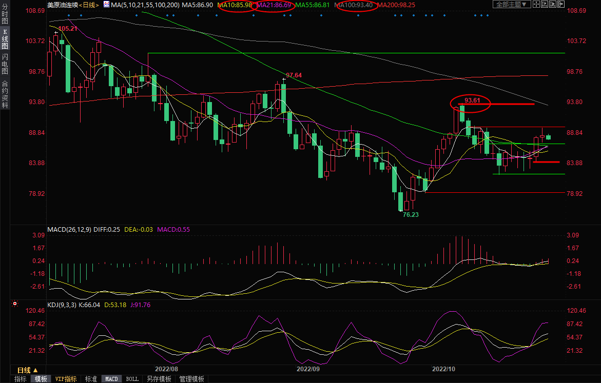 日线级别:震荡;MACD轻微金叉,KDJ轻微金叉,在失守21日均线86.69前,短线依然偏向多头,关注90关口附近阻力,若能顶破该阻力,则增加短线看涨信号,油价后市可能会进一步涨向100日均线93.40附近,10月10日高点和布林线上轨阻力都在该位置附近,若强势进一步上破,则增加中线看涨信号。